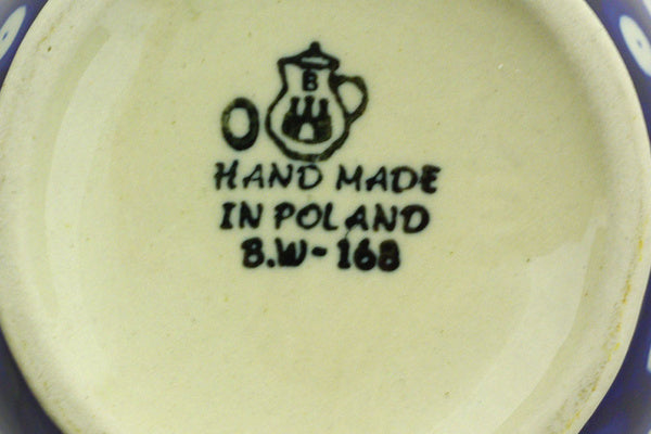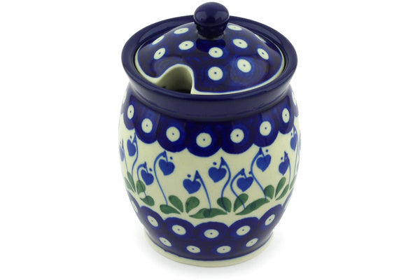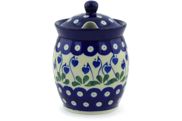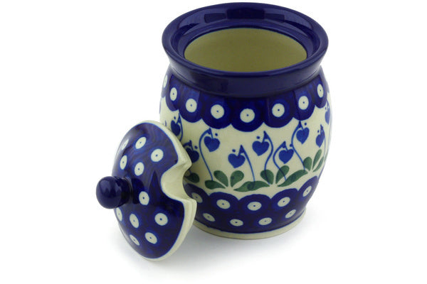 This Polish Pottery 5" Jar with Lid with Opening - Bleeding Heart Peacock is handmade and handpainted by the Ceramika Artystyczna factory in Boleslawiec, Poland.