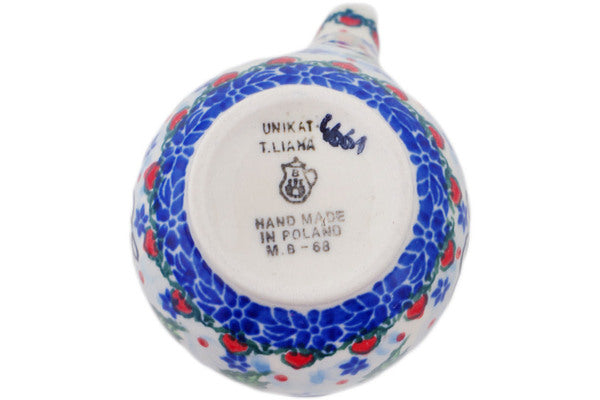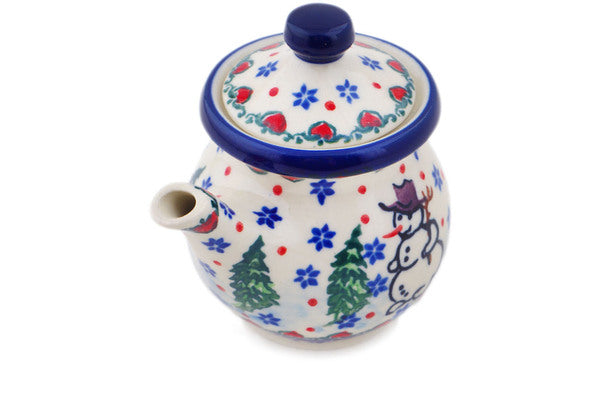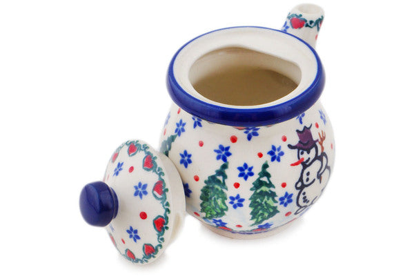 This Polish Pottery 5 oz Creamer with Lid - Dancing Snowman is handmade and handpainted by the Ceramika Artystyczna factory in Boleslawiec, Poland.