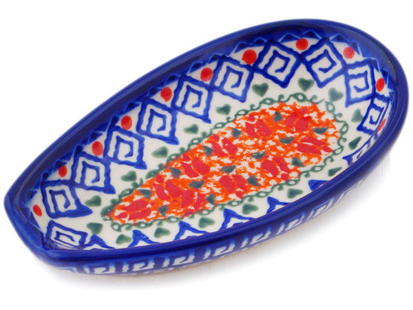 This Polish Pottery 5" Spoon Rest - Grecian Fire Tulips is handmade and handpainted by the Ceramika Bona factory in Boleslawiec, Poland.
