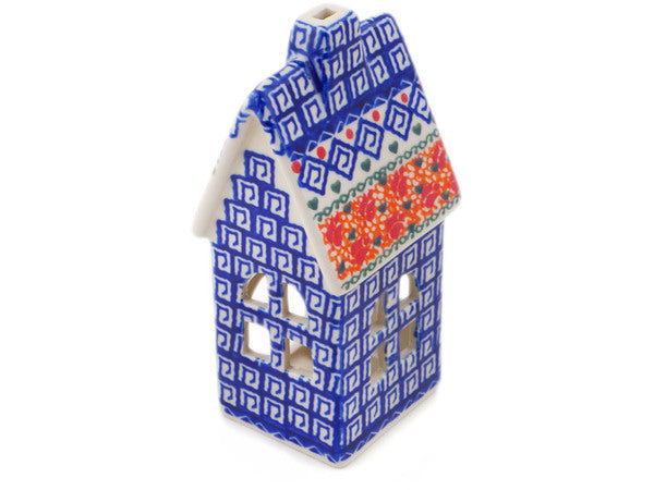 This Polish Pottery 6" House Shaped Candle Holder - Grecian Fire Tulips is handmade and handpainted by the Ceramika Bona factory in Boleslawiec, Poland.