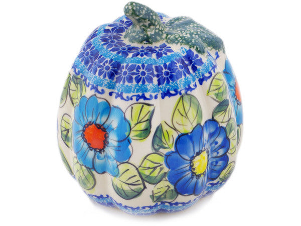 This Polish Pottery 6" Pumpkin Figurine - Bold Blue Poppies is handmade and handpainted by the Ceramika Bona factory in Boleslawiec, Poland.