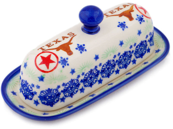 This Polish Pottery 7" Butter Dish - Texas State is handmade and handpainted by the Ceramika Bona factory in Boleslawiec, Poland.