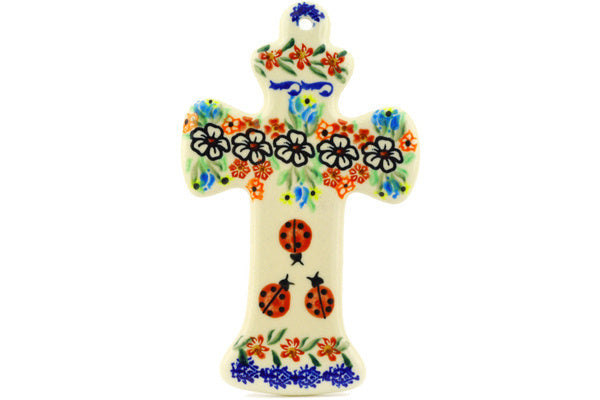 This Polish Pottery 7" Cross - Fanciful Ladybug is handmade and handpainted by the Ceramika Bona factory in Boleslawiec, Poland.