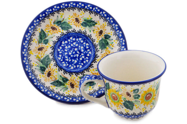 This Polish Pottery 7 oz Cup with Saucer - Sunflowers At Sunset is handmade and handpainted by the Ceramika Artystyczna factory in Boleslawiec, Poland.