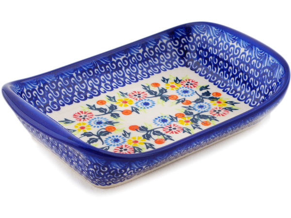 This Polish Pottery 7" Platter with Handles - Pastel Spring Wreath is handmade and handpainted by the Ceramika Bona factory in Boleslawiec, Poland.