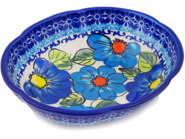 This Polish Pottery 7" Scalloped Bowl - Bold Blue Poppies is handmade and handpainted by the Ceramika Bona factory in Boleslawiec, Poland.