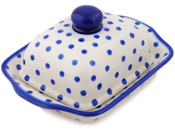 This Polish Pottery 8" Butter Dish - Blue Polka Dot is handmade and handpainted by the Ceramika Bona factory in Boleslawiec, Poland.