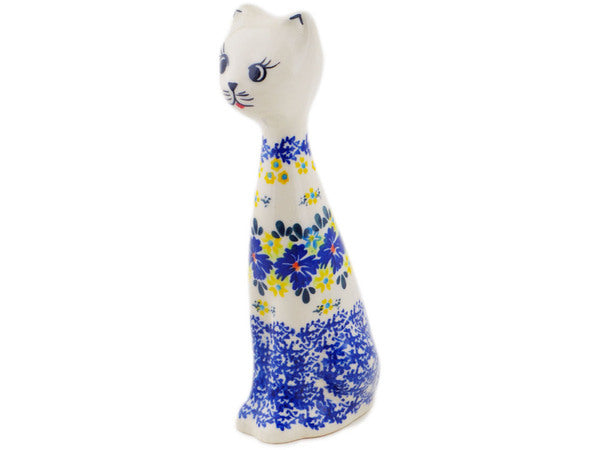 This Polish Pottery 8" Cat Figurine - Cornflower Meadow is handmade and handpainted by the Ceramika Bona factory in Boleslawiec, Poland.