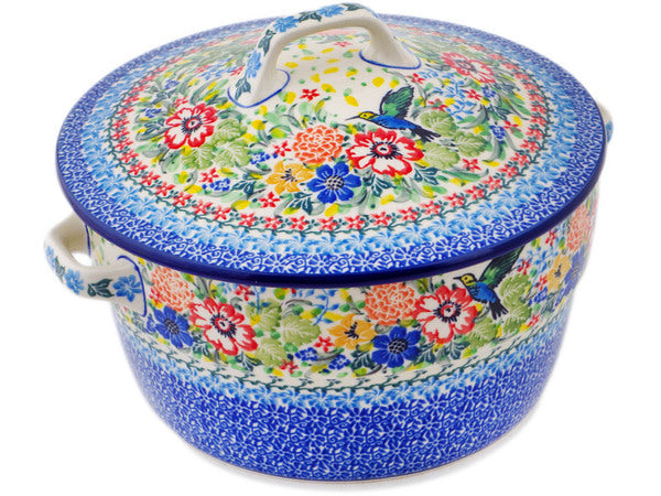 This Polish Pottery 9" Baker with Cover with Handles - Hummingbird Meadow is handmade and handpainted by the Ceramika Artystyczna factory in Boleslawiec, Poland.