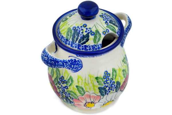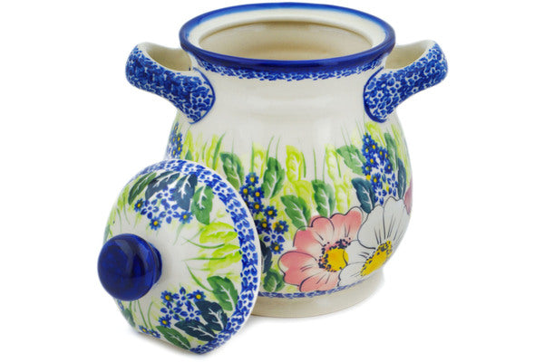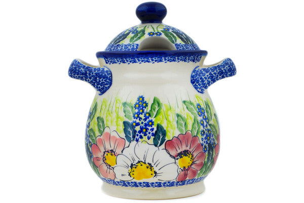 This Polish Pottery 8" Jar with Lid and Handles - Maroon Blossoms is handmade and handpainted by the Ceramika Nina factory in Boleslawiec, Poland.