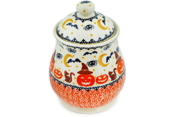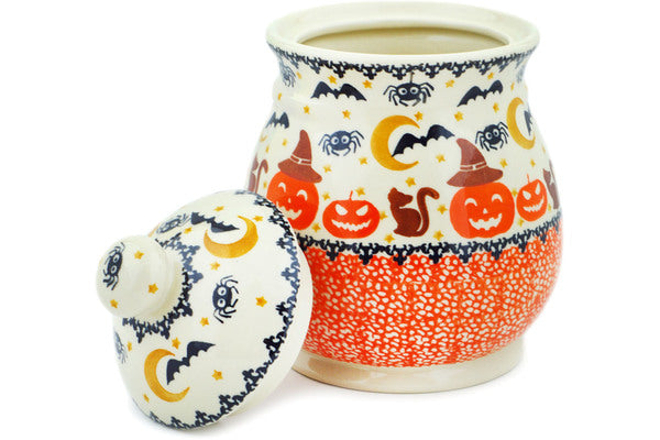 This Polish Pottery 8" Jar with Lid - Halloween Spooky Pumpkin is handmade and handpainted by the Ceramika Bona factory in Boleslawiec, Poland.