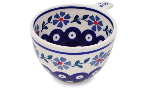 This Polish Pottery 8 oz Measuring Cup - Peacock Forget-Me-Not is handmade and handpainted by the Manufaktura factory in Boleslawiec, Poland.