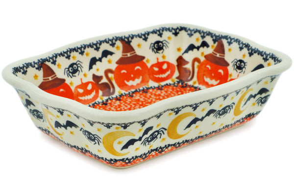 This Polish Pottery 8" Rectangular Baker - Halloween Spooky Pumpkin is handmade and handpainted by the Ceramika Bona factory in Boleslawiec, Poland.