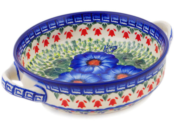 This Polish Pottery 8" Round Baker with Handles - Brilliant Butterfly Popp is handmade and handpainted by the Ceramika Bona factory in Boleslawiec, Poland.