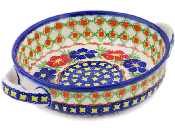 This Polish Pottery 8" Round Baker with Handles - Paradise Poppy is handmade and handpainted by the Ceramika Bona factory in Boleslawiec, Poland.