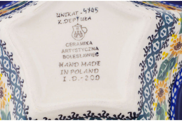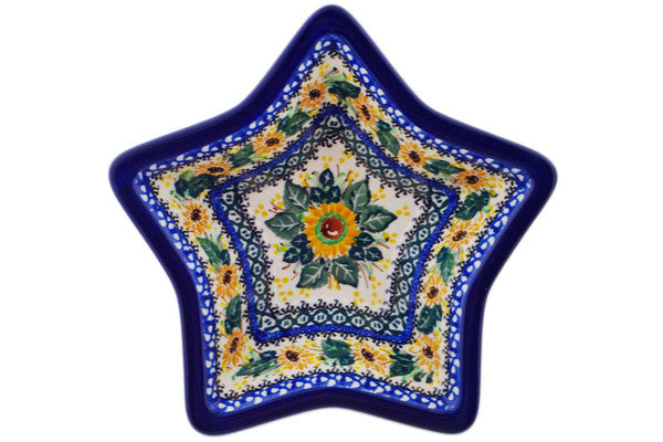 This Polish Pottery 8" Star Shaped Bowl - Sunflowers At Sunset is handmade and handpainted by the Ceramika Artystyczna factory in Boleslawiec, Poland.
