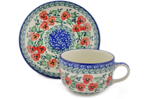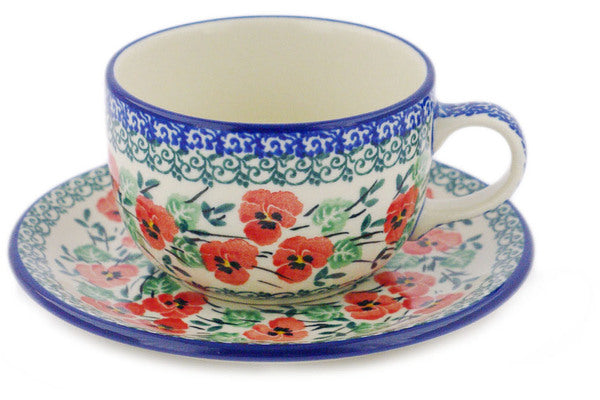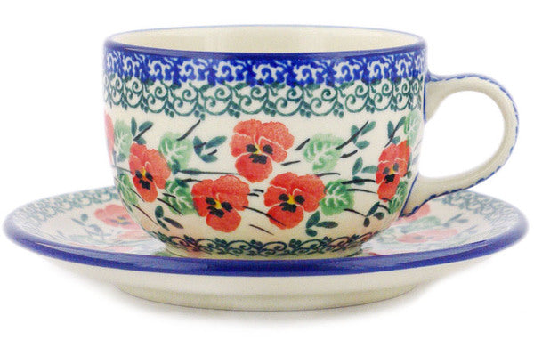 This Polish Pottery 9 oz Cup with Saucer - Red Pansy is handmade and handpainted by the Ceramika Artystyczna factory in Boleslawiec, Poland.