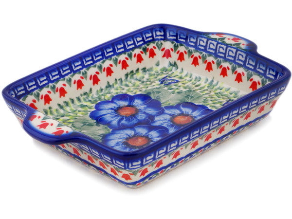 This Polish Pottery 9" Rectangular Baker with Handles - Brilliant Butterfly Popp is handmade and handpainted by the Ceramika Bona factory in Boleslawiec, Poland.