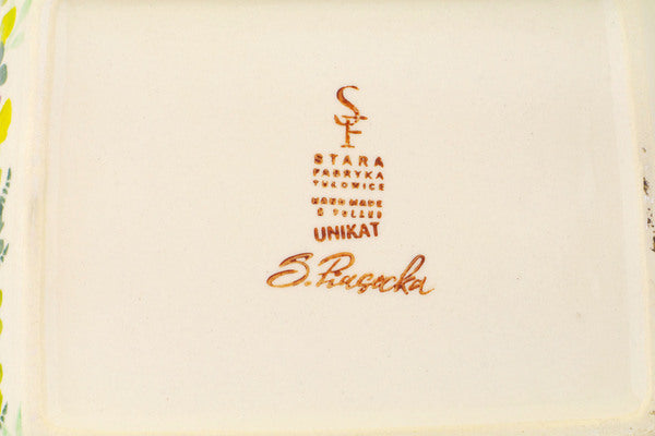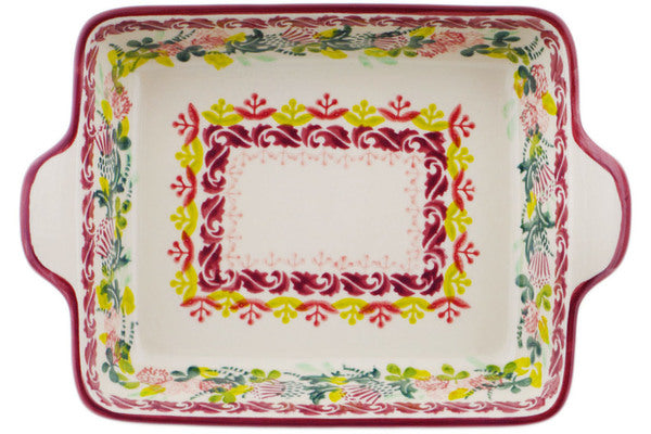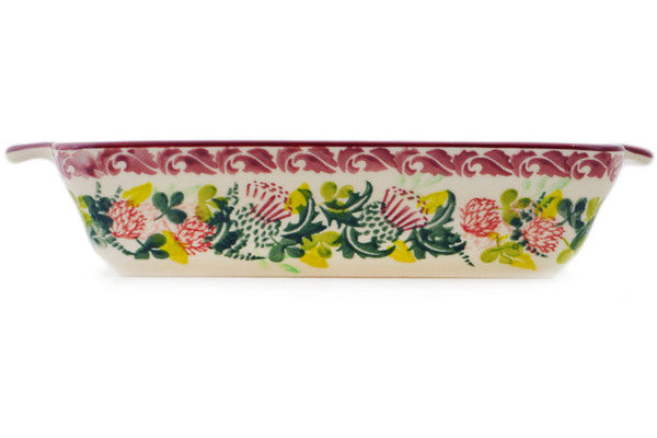 This Polish Pottery 9" Rectangular Baker with Handles - Thriving Thistle Wreath is handmade and handpainted by the Stara Fabryka factory in Boleslawiec, Poland.