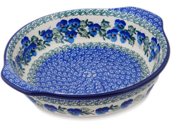 This Polish Pottery 9" Round Baker with Handles - Blue Pansy is handmade and handpainted by the Ceramika Artystyczna factory in Boleslawiec, Poland.