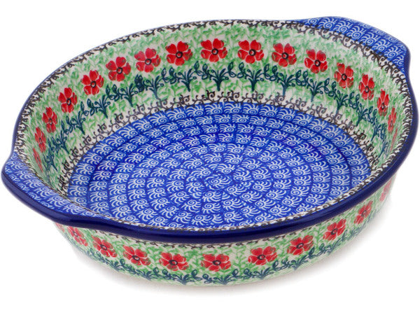 This Polish Pottery 9" Round Baker with Handles - Maraschino is handmade and handpainted by the Ceramika Artystyczna factory in Boleslawiec, Poland.