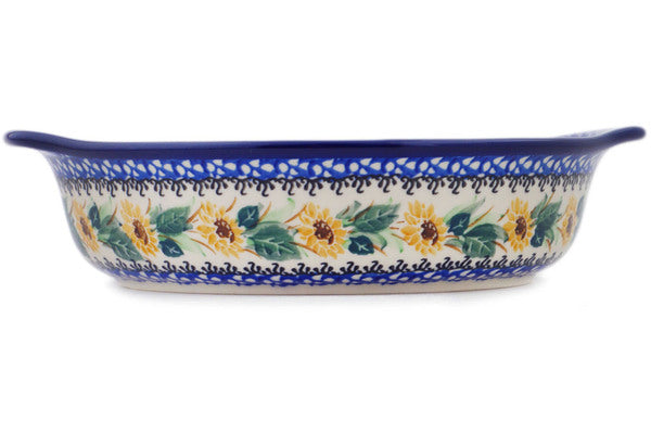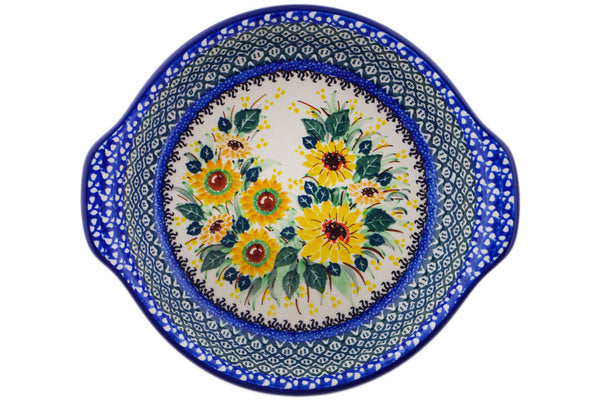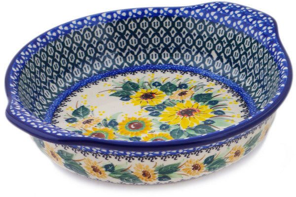 This Polish Pottery 9" Round Baker with Handles - Sunflowers At Sunset is handmade and handpainted by the Ceramika Artystyczna factory in Boleslawiec, Poland.