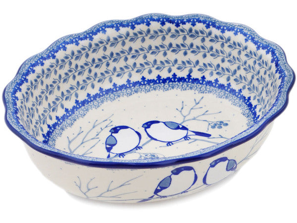 This Polish Pottery 9" Scalloped Bowl - Waiting Birds is handmade and handpainted by the Ceramika Artystyczna factory in Boleslawiec, Poland.