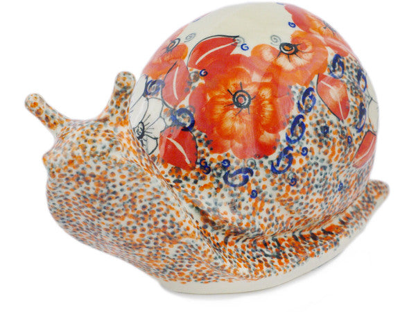 This Polish Pottery 9" Snail Figurine - Poppy Passion is handmade and handpainted by the Ceramika Bona factory in Boleslawiec, Poland.