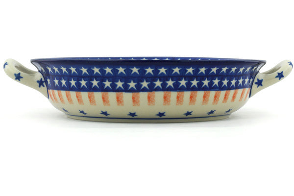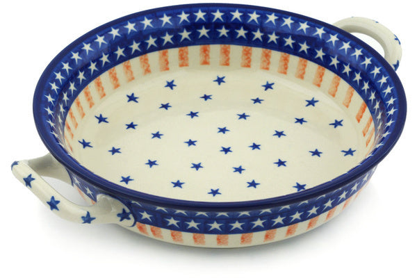 This Polish Pottery 10" Round Baker with Handles - Classic Americana is handmade and handpainted by the Ceramika Artystyczna factory in Boleslawiec, Poland.