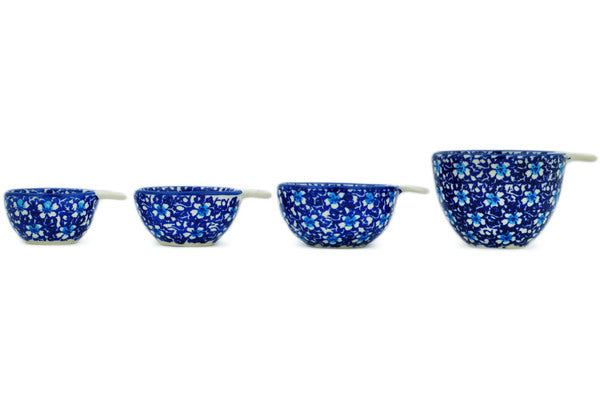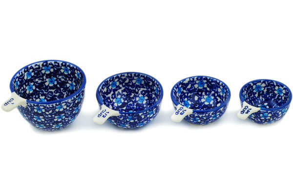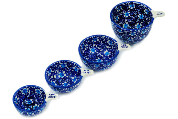 This Polish Pottery 8 oz Set of 4 Measuring Cups - Flowers On The Lake is handmade and handpainted by the Manufaktura factory in Boleslawiec, Poland.
