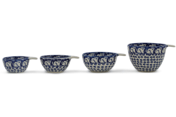 This Polish Pottery 8 oz Set of 4 Measuring Cups - Meow is handmade and handpainted by the Manufaktura factory in Boleslawiec, Poland.
